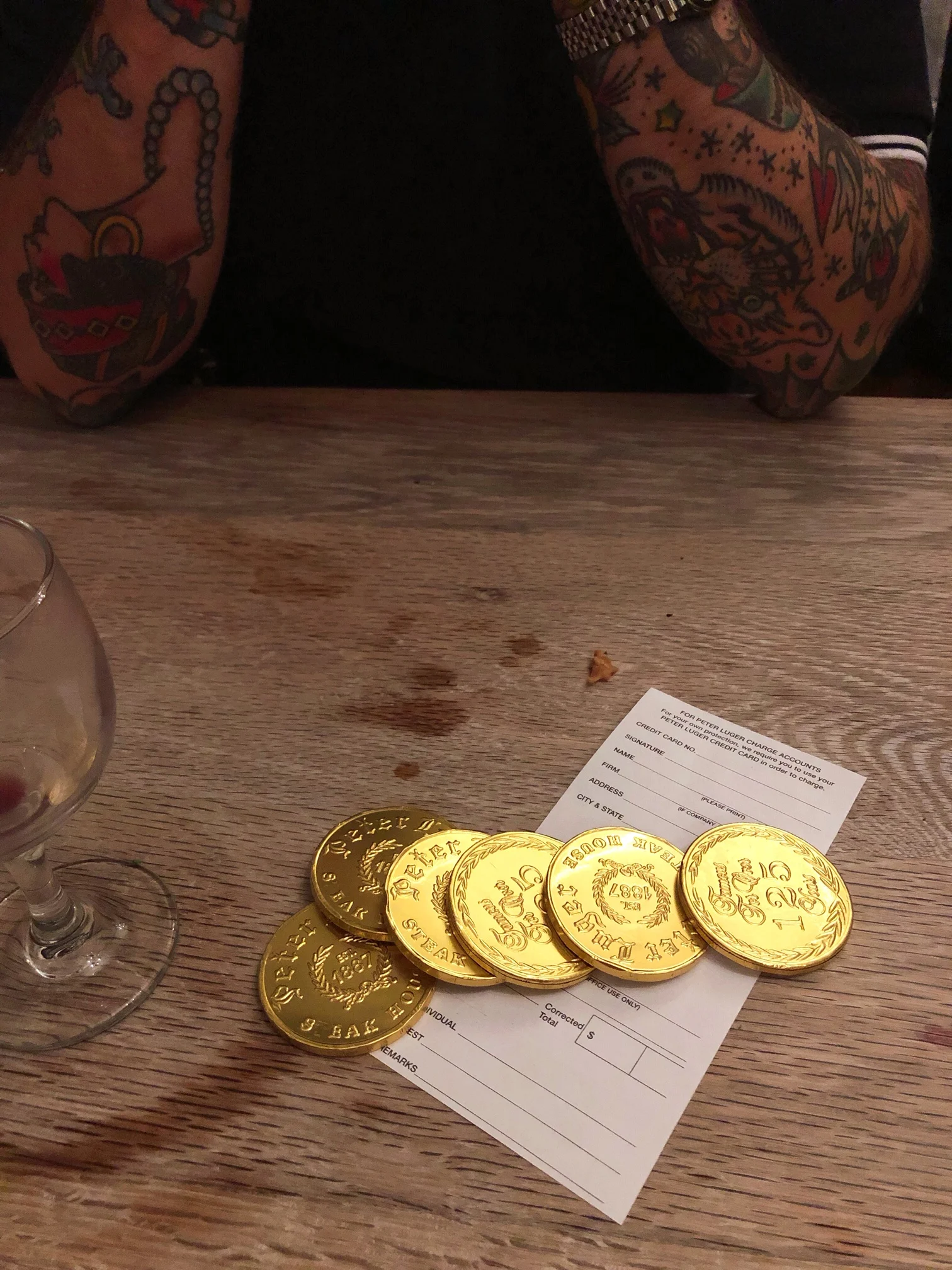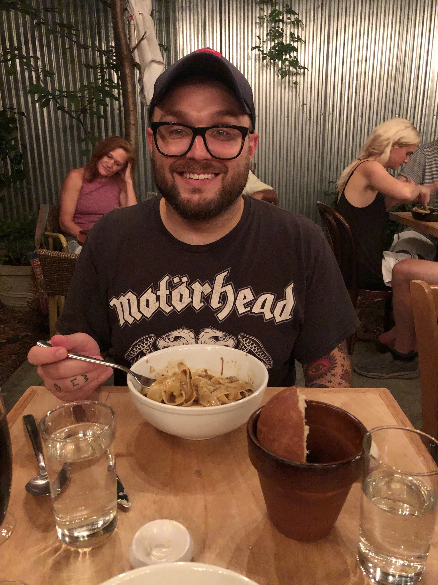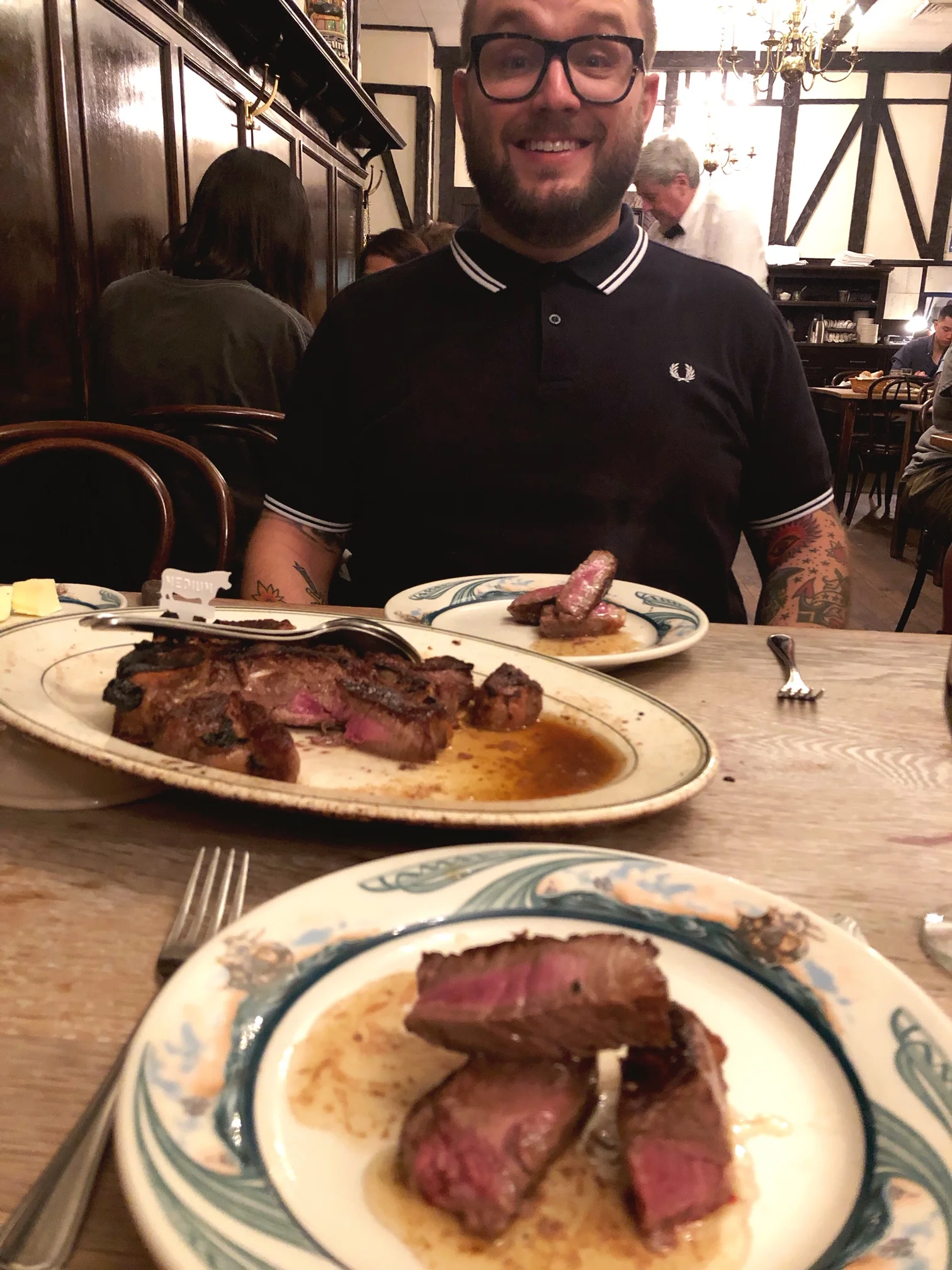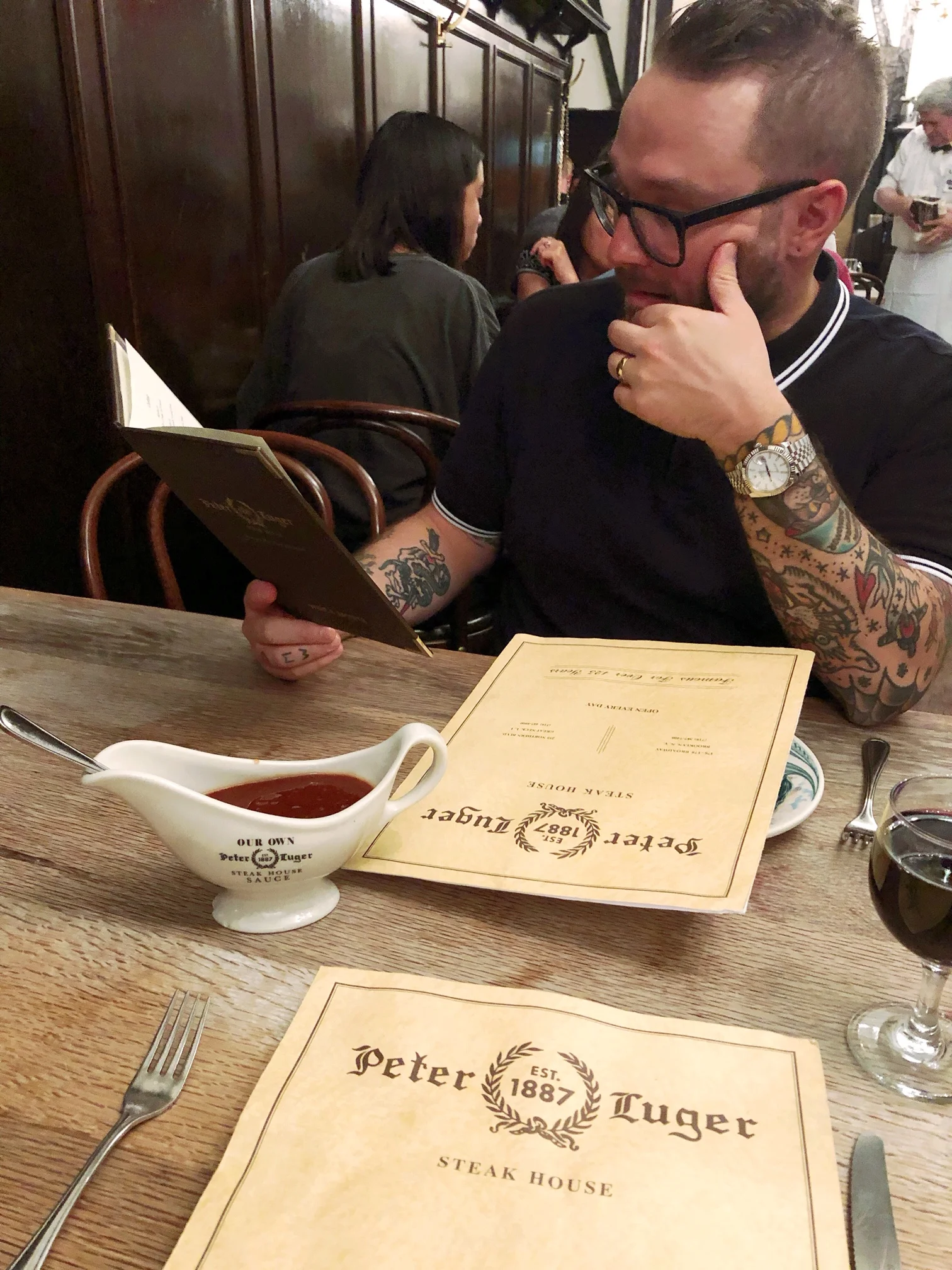 On our sleepy 8 AM trek to The William Vale Pool, we stopped for bagels and coffee at Baker’s Dozen. If you want a good seat at the pool, you gotta get there early! The bar and food service started at 11 and we celebrated and ate and drink til about 2 PM. It was one of the most relaxing days of my life. After drinking like six margaritas I took a power nap in our hotel room and we were up in time for a late night dinner at Peter Luger. It’s an old steak house that still feels like an old time steak house and Z likes to go here with his friends. I’ve always felt a little left out that I had never gone and was so excited to finally go to this mystery cash only restaurant! It was everything I expected it to be. After dinner we shared a bottle of Bedell sparking rose with some friends. We sat on the balcony and talked for awhile and looked at the empty streets of Williamsburg below us.